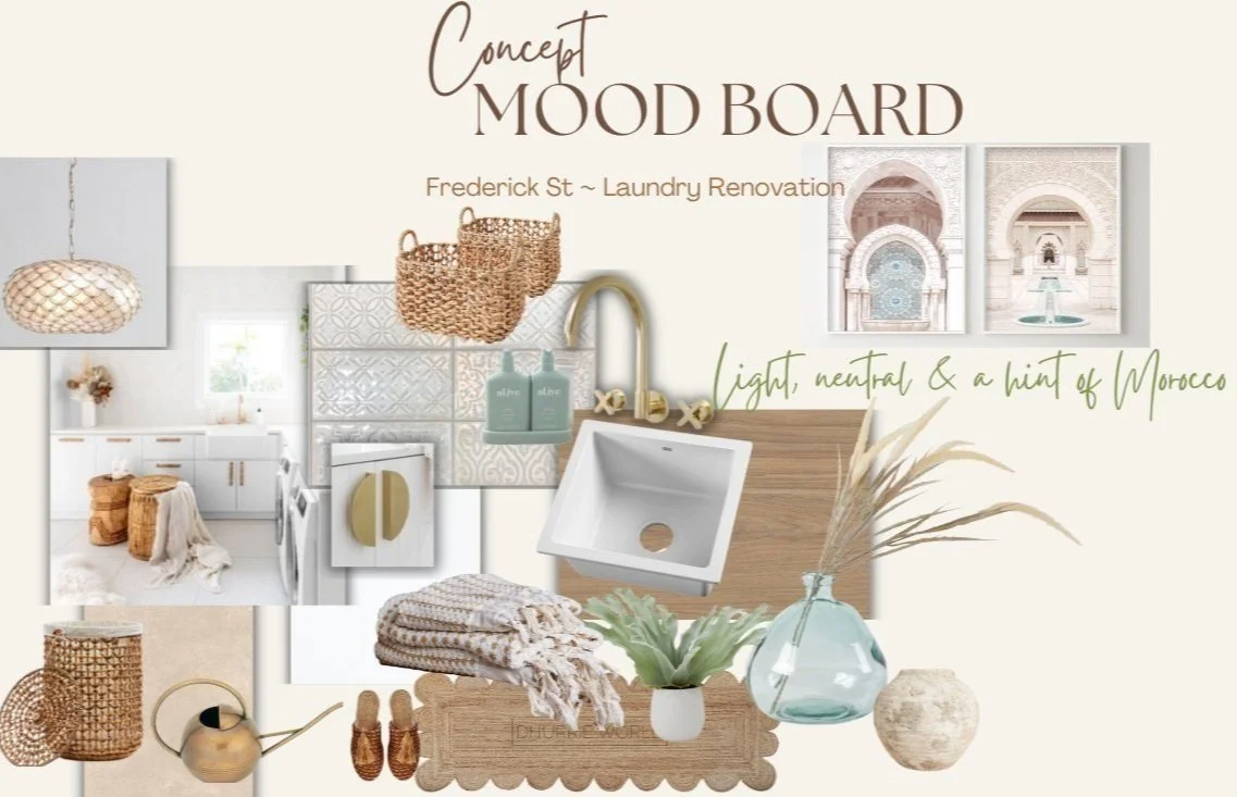 The redesign turns a once awkward utility zone into a calm, functional space — brighter, better organised, and built around generous storage. The brief was “neutral and minimalist,” but with a subtle nod to Morocco: tactile pattern, honeyed brass, and woven texture that feels collected, not themed.