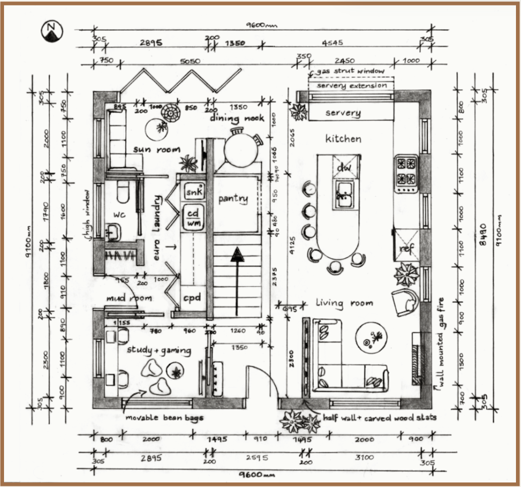 To strengthen indoor–outdoor flow, the design introduces large folding glass doors to the north-facing rear wall, opening to a generous deck. A gas-strut servery window supports easy outdoor entertaining and everyday family living.