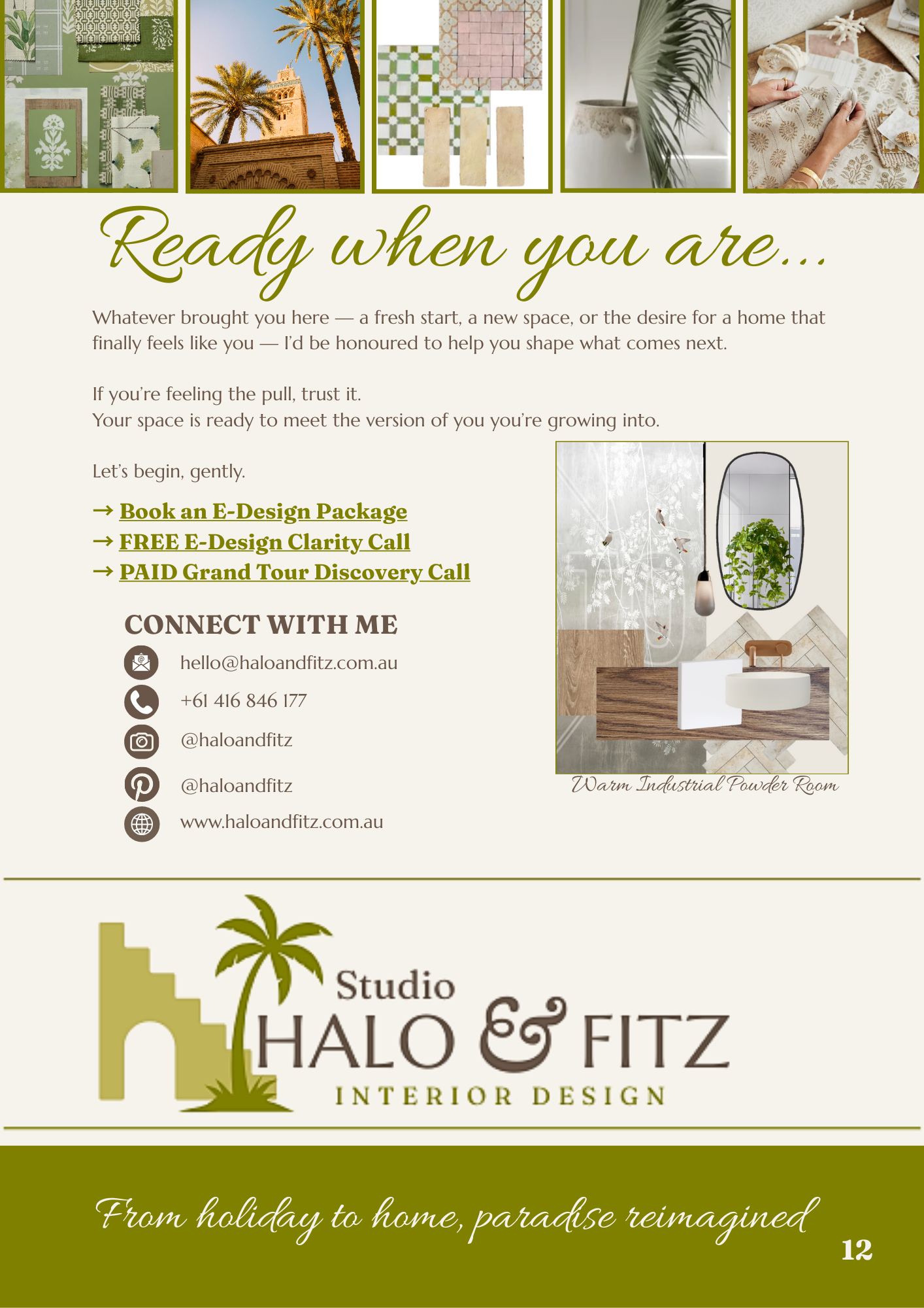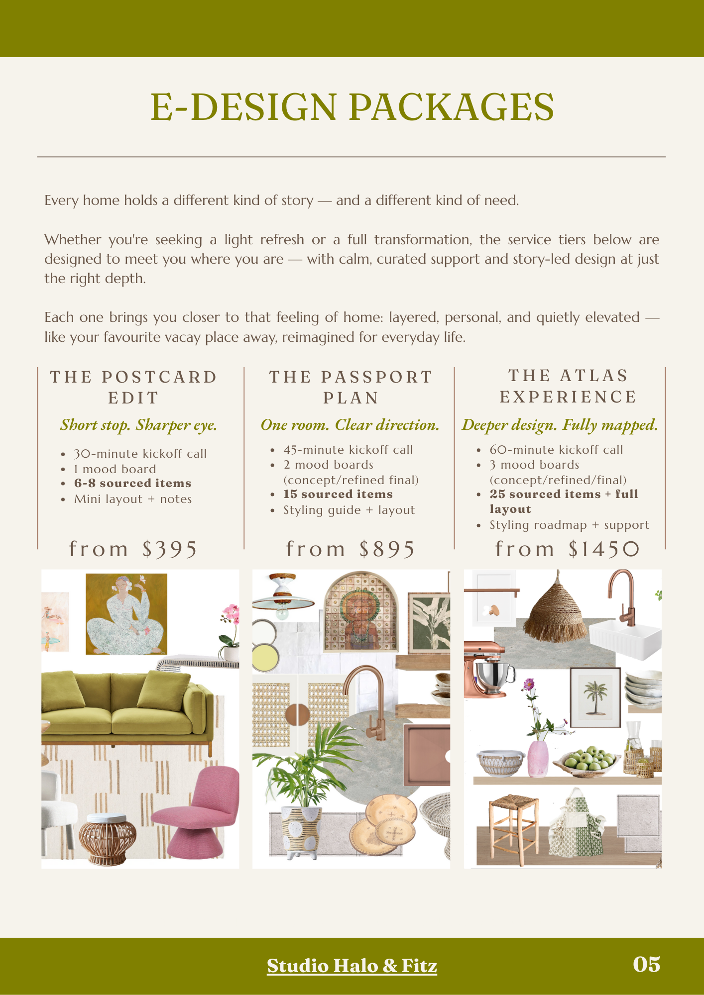 Every home holds a different story — and every client needs a different kind of guidance. Studio Halo & Fitz offers two design pathways: E-Design for focused, room-by-room clarity (Australia-wide), and Full Scope Design for immersive, in-person support.